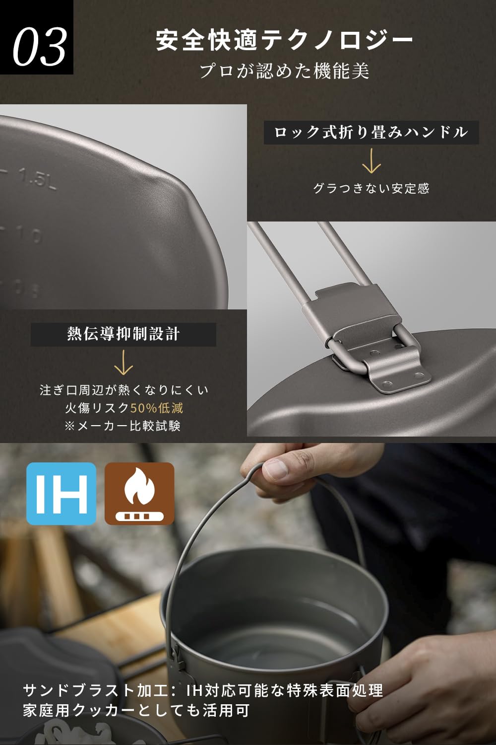 チタンは高温に強いため、直火調理に対応。