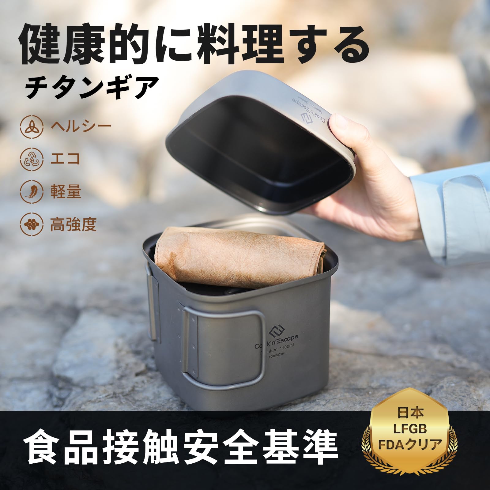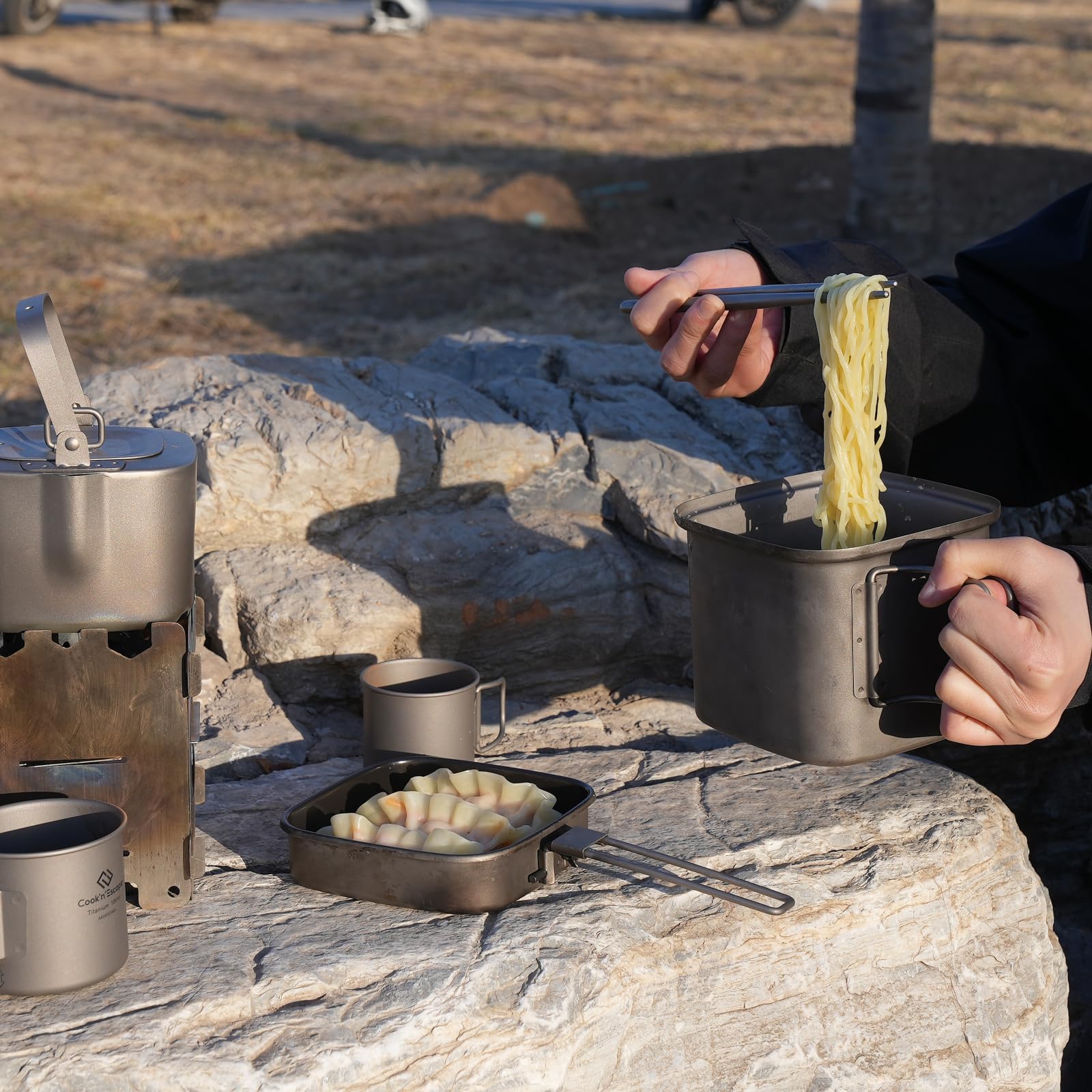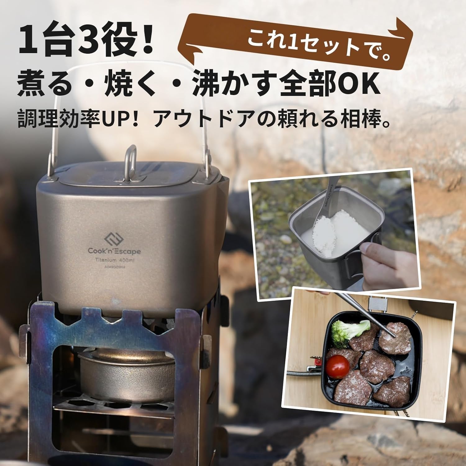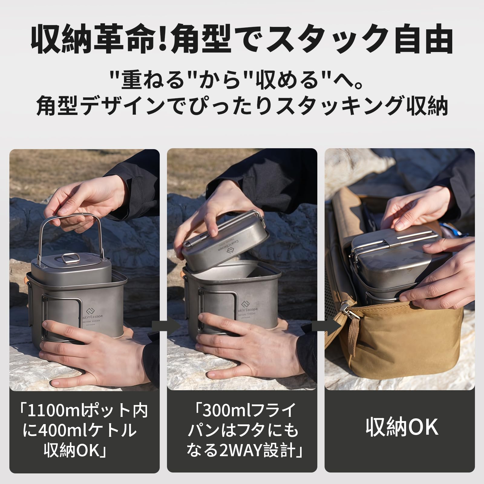 - 「焚き火料理の幅を広げる、チタン角型クッカーセット」鍋・フライパン・ケトルが1セットに。三拍子揃ったこのチタンクッカーは、調理スタイルに合わせて自在に使える万能セット。ソロキャンから災害備蓄まで頼れる存在です。
