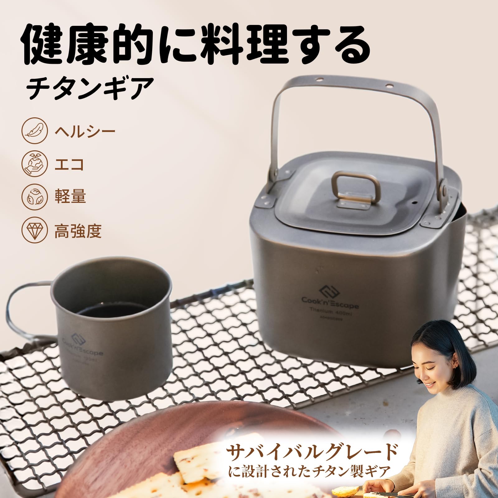 - 「IHも直火もOK!キッチンでも焚き火でも使える二刀流」家庭用IHクッキングヒーターでも使用でき、普段の台所でも大活躍。もちろん焚き火やガスバーナーもOKで、使用シーンを選ばない万能チタンやかん。