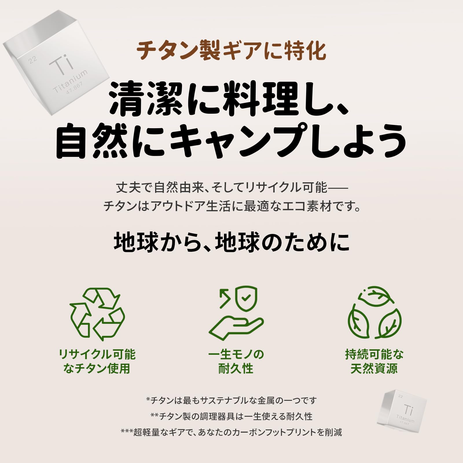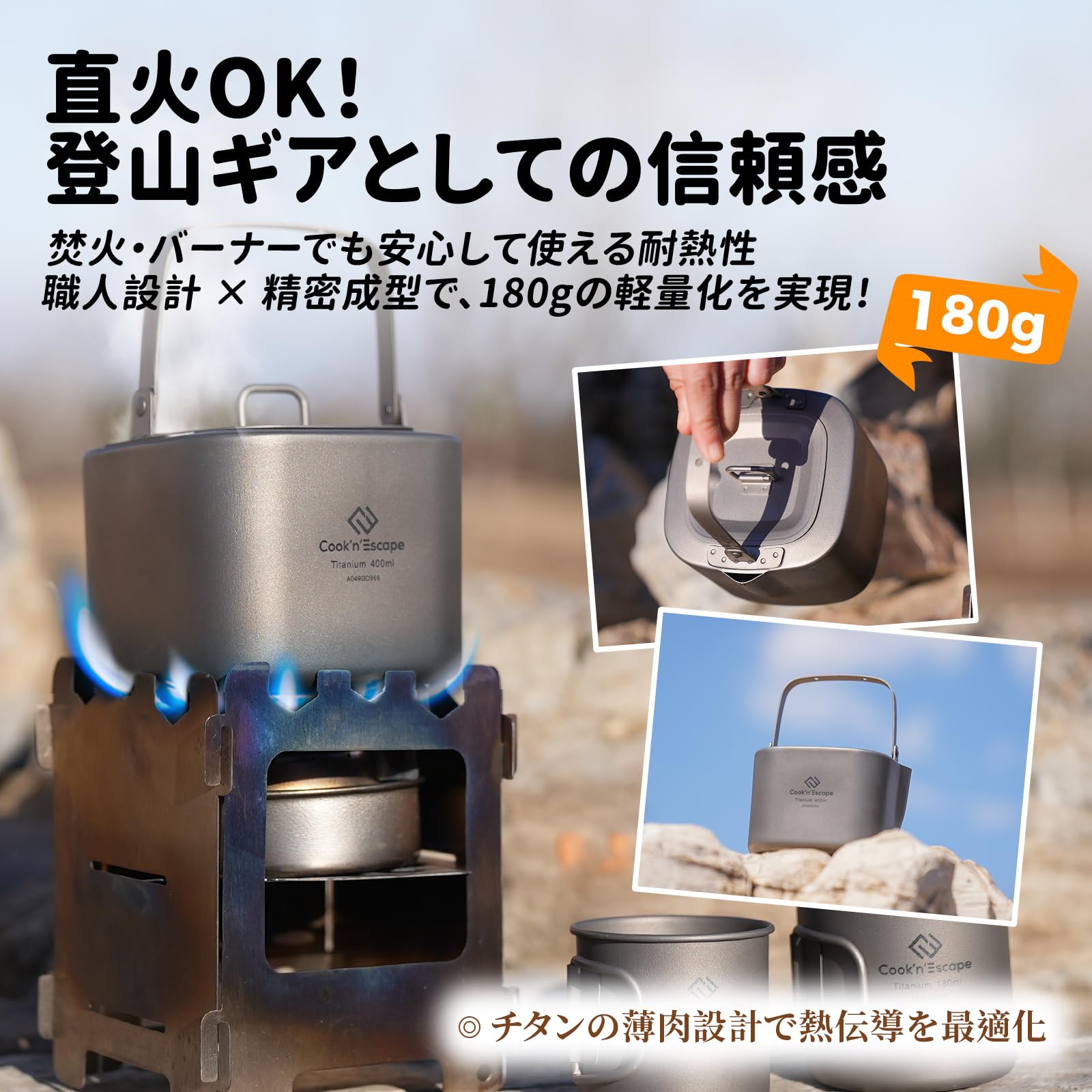- 「180gの軽さ、でも頼れる堅牢性・過酷な環境にも耐える相棒」純チタンの中でも高純度TA1グレードを使用し、軽量なのに歪みにくい構造。落としても曲がりにくく、標高の高い登山やバイクパッキングに◎。